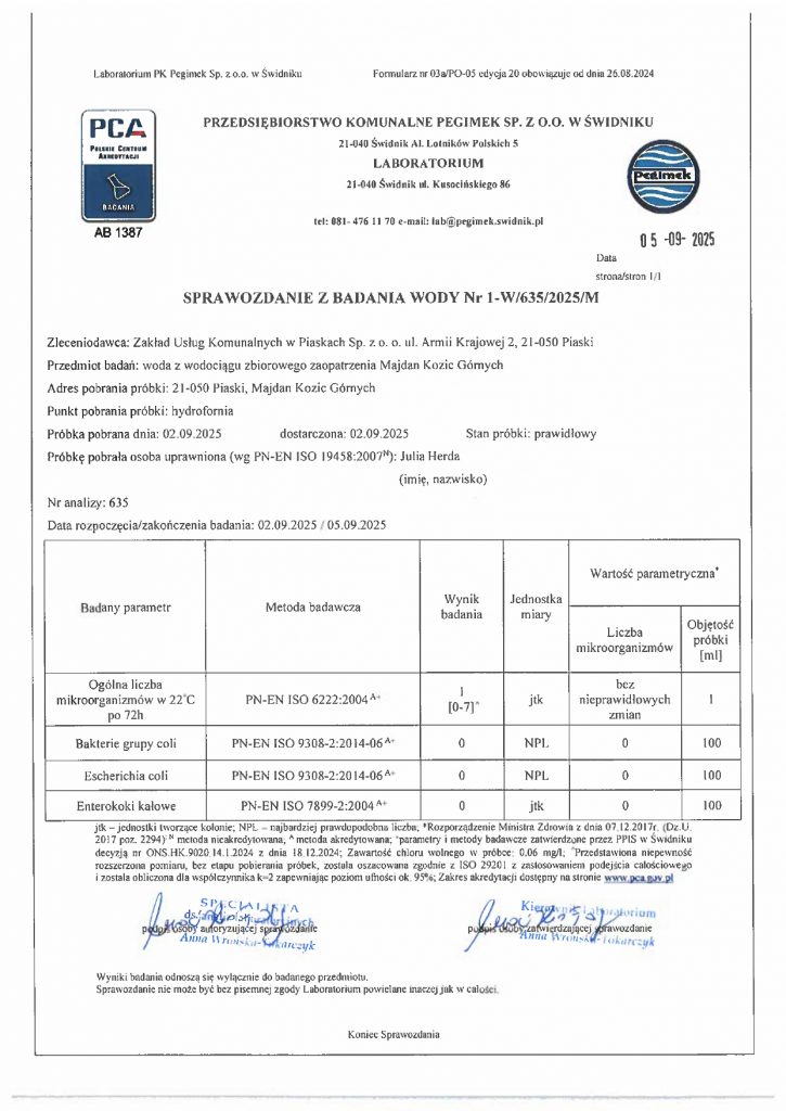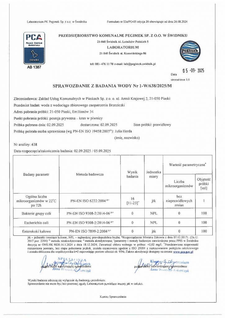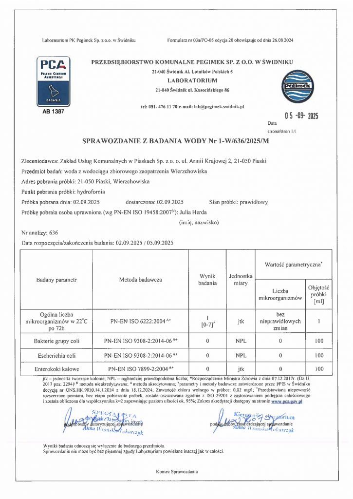 Aktualne wyniki badań wody w poszczególnych miejscowościach