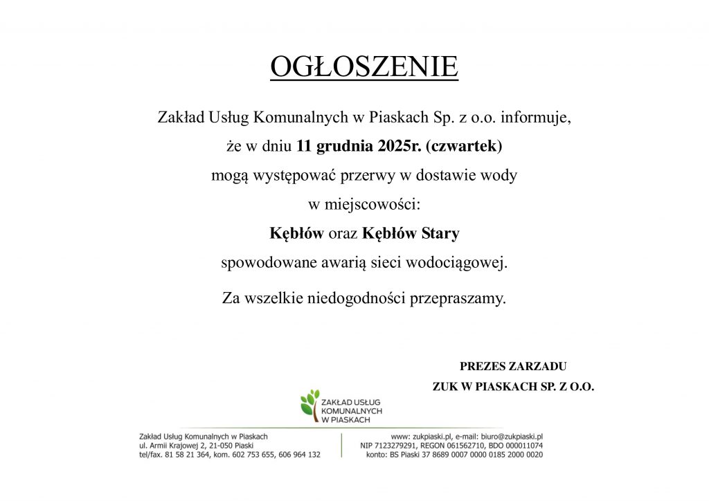 Awaria sieci wodociągowej (11 grudnia 2025r.) w m. Kębłów oraz Kębłów Stary