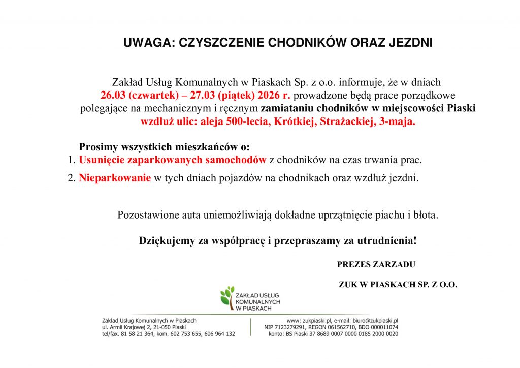 Czyszczenie chodników oraz jezdni: 26-27.03.2026 r.