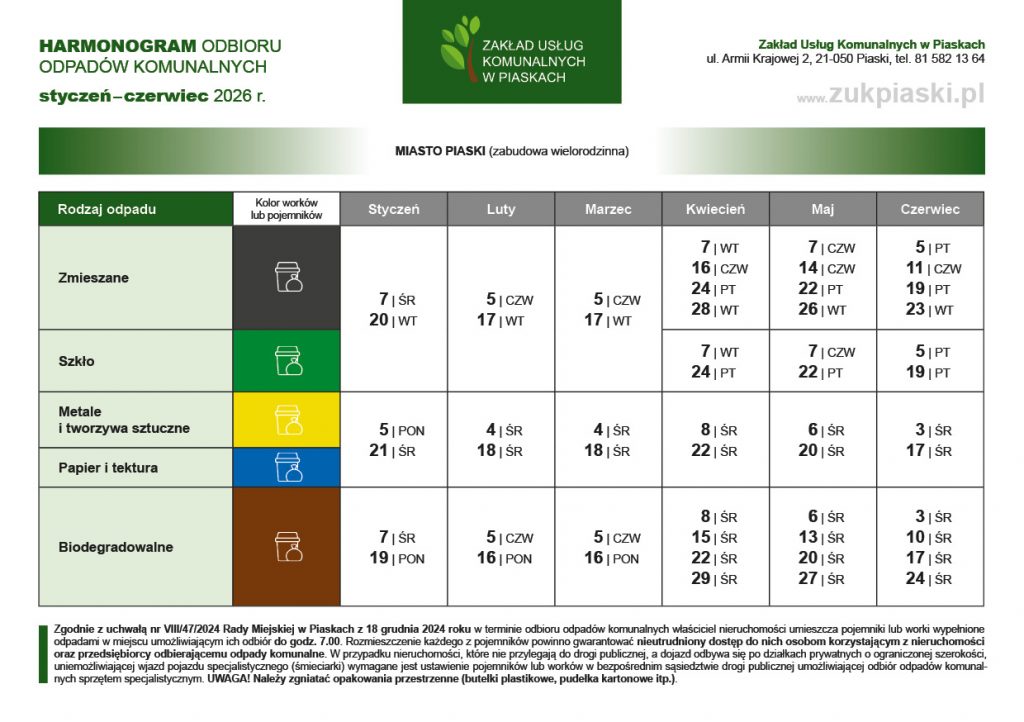 Harmonogram odbioru odpadów dla zabudowy wielorodzinnej (bloki) w miejscowości Piaski na okres styczeń – czerwiec 2026 r.