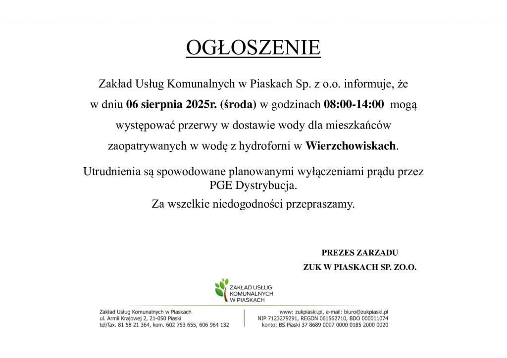 Przerwa w dostawie energii na hydroforni w Wierzchowiskach – 06.08.2025r.