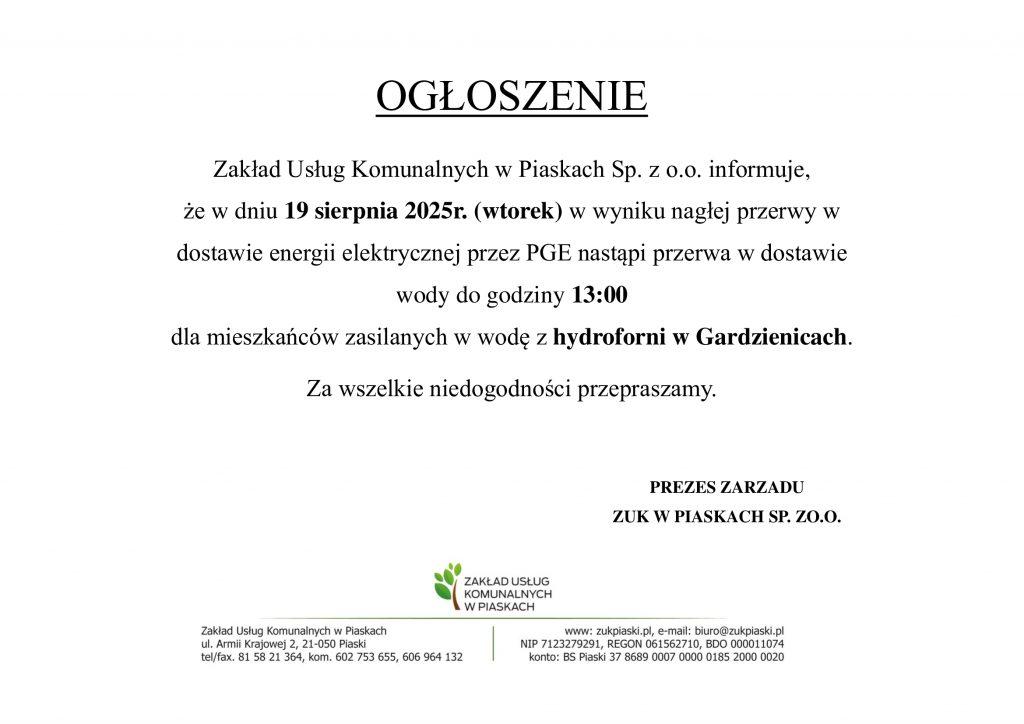 Przerwa w dostawie wody spowodowana przerwą w dostawie prądu dla mieszkańców zasilanych w wodę z hydroforni Gardzienicach – 19.08.2025r.