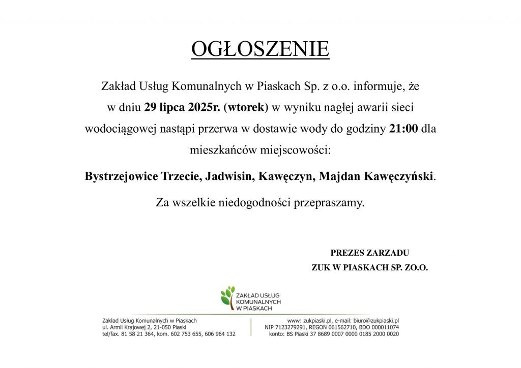 Przerwa w dostawie wody w m. Bystrzejowice Trzecie, Jadwisn, Kawęczyn, Majdanan Kawęczyński – 29.07.2025r.