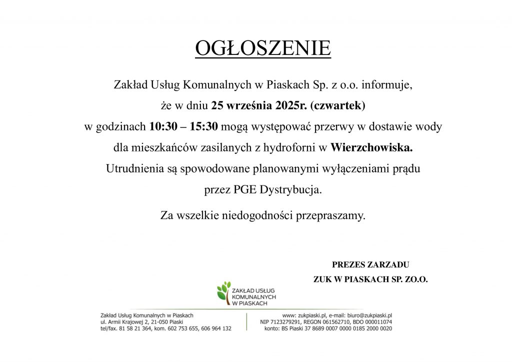 Przerwy w dostawie wody dla mieszkańców zasilanych z hydroforni w m. Wierzchowiska – 25.09.2025r.