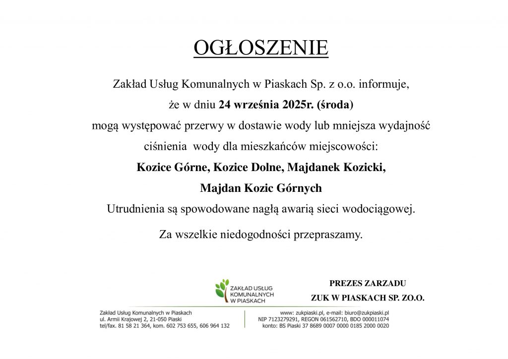 Przerwy w dostawie wody w dniu 24.09.2025r., dla m. Kozice Górne, Kozice Dolne, Majdanek Kozicki, Majdan Kozic Górnych