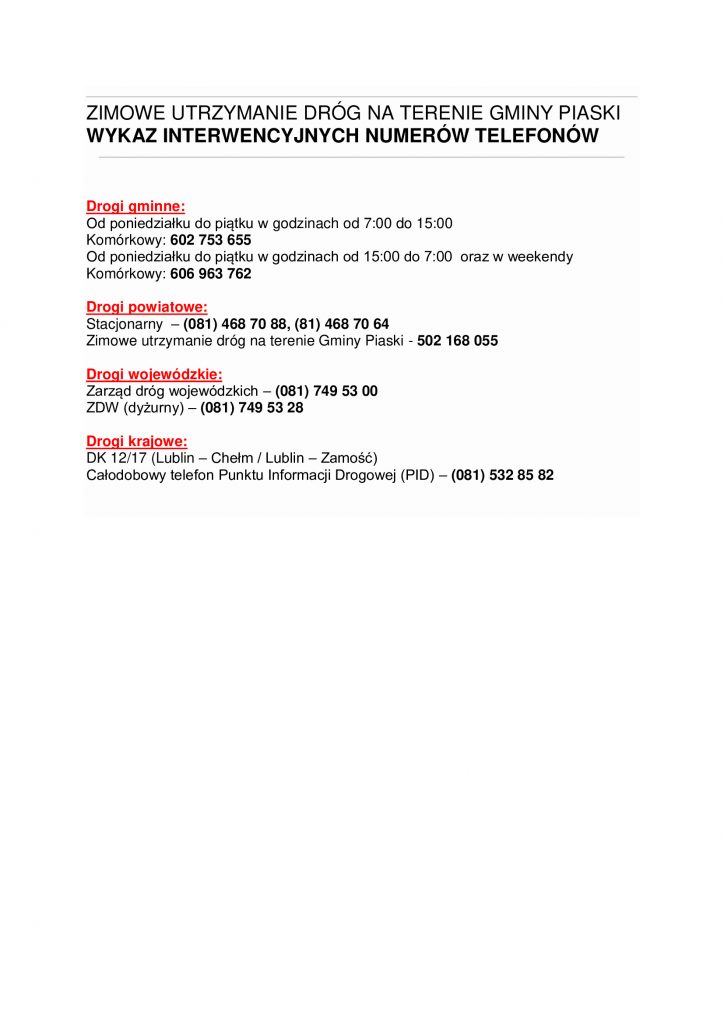 Wykaz telefonów – zimowe utrzymanie dróg na terenie Gminy Piaski
